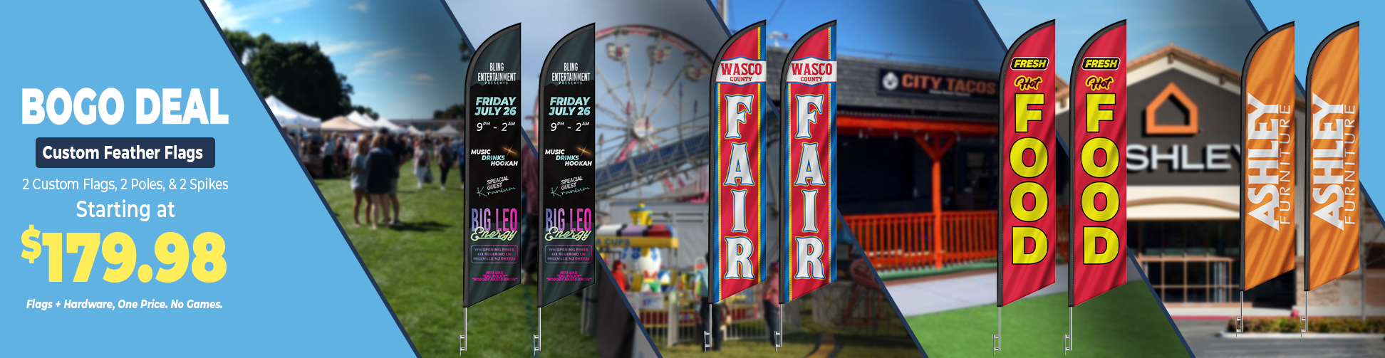 Need a flag banner? Delve into this exclusive section of our website to uncover a treasure trove of special, limited-time deals that span across a variety of products. From custom feather flags and business banners to stock items, custom inflatable tube men, and more, these offers rotate periodically, ensuring a diverse range of enticing opportunities. Remember, these exclusive deals are only revealed through our monthly marketing emails, so subscribe now to seize these fleeting yet exceptional offers tailored just for you.