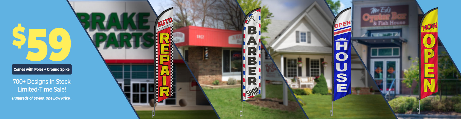 If you are on a budget or looking to save money, we have over 600 in stock and ready-to-ship flag banner designs to choose from. Our stock swooper flags are in stock and ready to ship. Orders placed before 12pm PST usually ship the same day! Click on the flag styles under the stock section to view our low-cost stock flag inventory. These flags are favorites of all businesses for outdoor advertising. In-stock banner styles are only $14.99 for a replacement flag or $55 for a complete kit. Purchasing these promotional flags is a must! These business flags and banners typically pay for themselves within days, if not hours. We are constantly increasing our inventory — check back often for new and updated flag banner designs.